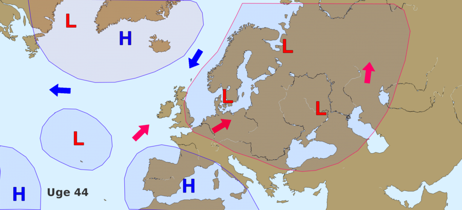 Flere atlantiske lavtryk ventes i uge 44 at tage en bane fra havet vest for De Britiske Øer op over Norskehavet og Mellemskandinavien. Det betyder flere frontpassager med regn og skyer fra sydvest og vest i en relativ mild og blæsende vejrtype. Der bliver også plads til enkelte tørvejrsdage med bedre plads til solen, bortset fra enkelte byger.