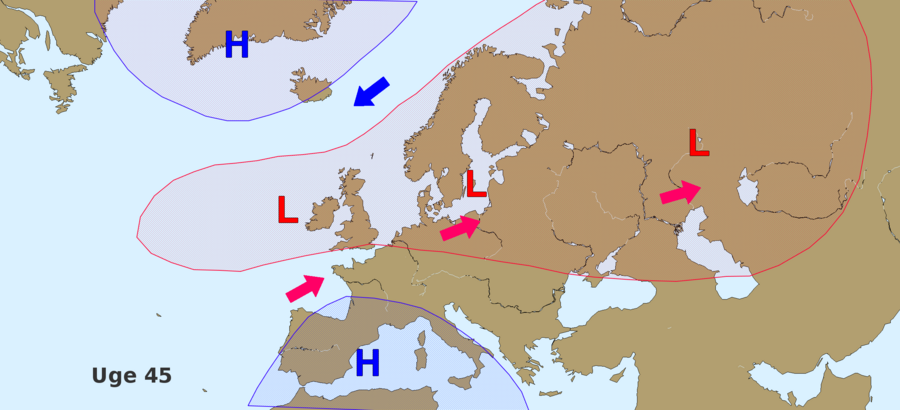Der udspiller sig ikke i første omgang tydelige ændringer i den overordnede vejrsituation i uge 45. Dog er der øget risiko for, at nogle af lavtrykkene udvikler sig kraftigere og giver et ordentlig blæsevejr – og nogle dage senere kan sende koldere luft ned over landet fra nordlige retninger med risiko for nattefrost eller haglbyger. Vi kigger altså derfor overordnet set ind i en relativ mild, våd og blæsende uge med mange skyer. I tilfælde af en kraftigere lavtrykspassage, hvor vinden går i nordvest og nord, kan solen også titte frem mellem bygerne.