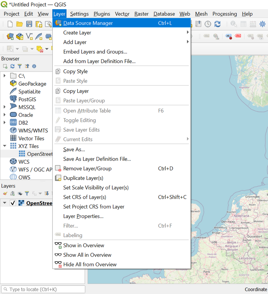 Open the Layer menu in the top bar and choose Data Source Manager.