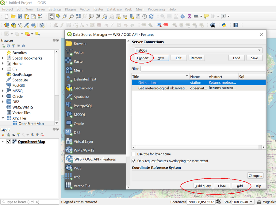 - If you want to use the observation feature as a layer you most likely have to build a data query since there are too many observations to practically display in QGIS.