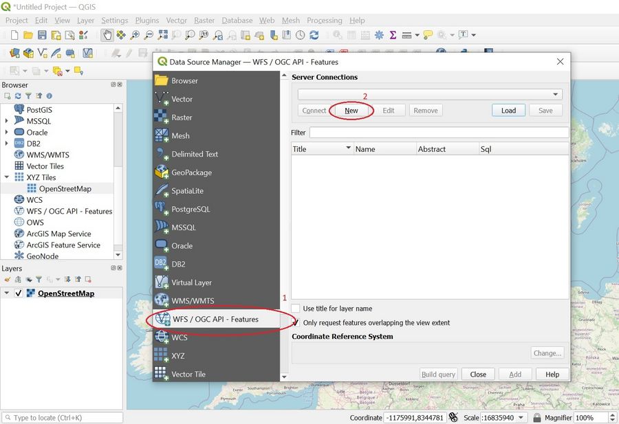 - In the popup window choose WFS / OGC API - Features from the menu on the left hand side.