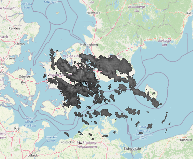 The composite provides the best overview of radar reflectivity by combining radar images from all of DMI’s weather radars into one composite image of the radar reflectivity. In areas of overlap the maximum value is chosen. The time interval of data is 5 minutes and the pixel size is 500 m. On minute numbers 0, 10 ..., 50, a composite based on conventional full range scans is generated while the minute numbers 5, 15, ..., 55 are reserved for a composite based dedicated Doppler scans.