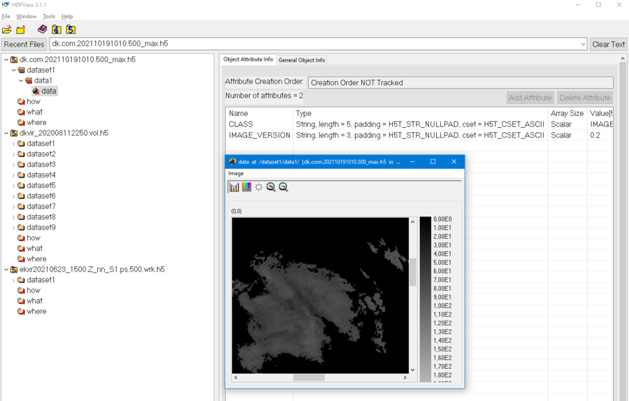 The HDF viewer is, in the example, loaded with a volume, pseudo CAPPI and composite radar file:
