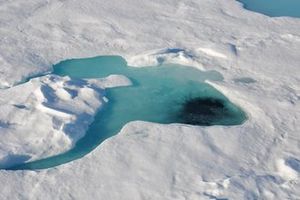 Smeltevandshuller dannes, når smeltevandspytter semlter sig lodret ned gennem isen.