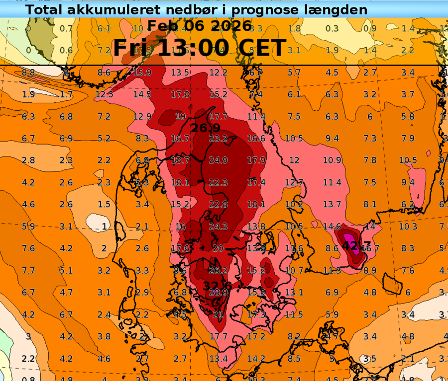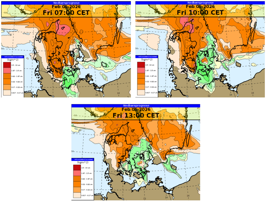 Der er fortsat en del usikkerhed knyttet til den præcise placering af de største snemængder. Det bliver udbredt snevejr i Danmark, men de kraftigste mængder sne ventes at falde i et relativt ”smalt” nord-syd-orienteret bånd, og selv små forskydninger i prognoserne kan betyde, at de kraftigste mængder rammer enten længere mod vest eller øst. På nuværende tidspunkt er der god konsistens i prognoserne, som peger på et lokalt snemængdepotentiale på 20–30 cm i selve fronten.