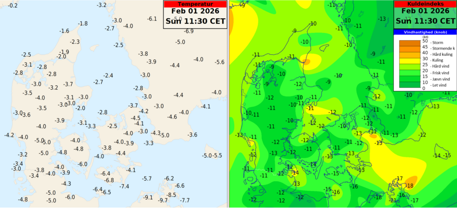 Blæsten får det til at føles langt koldere, end det egentlig er - man taler om det såkaldte kuldeindeks. Med de førnævnte temperaturer og blæsten føles det faktisk som temperaturer mellem 10 og 15 graders frost, så der er ikke noget at sige til, hvis du synes, det er bidende koldt i dag.