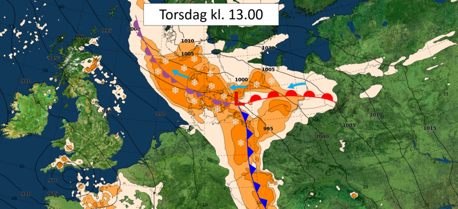Torsdag kan hele landet få udbredt sne, måske snestorm samt frisk vind til kuling fra øst. Der kan komme fygning mange steder. Dog er udsigten fra torsdag endnu meget usikker, men man gør klogt i at holde øje med den, særligt hvis man skal færdes i trafikken torsdag.