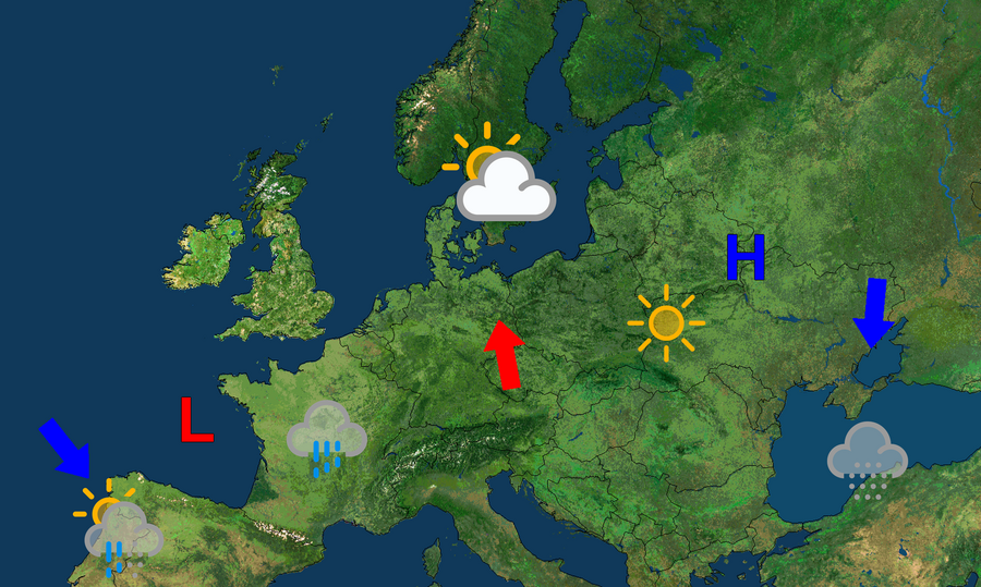 Nedenstående vejrkort er i grove træk den kommende uges vejr. Men der kommer dog også regn til Danmark. Og størst risiko for regn har vi torsdag, hvor en svag front skal passere landet. Derefter ser det ud til, at det holder tørt, dog med en del skyer i perioder.
