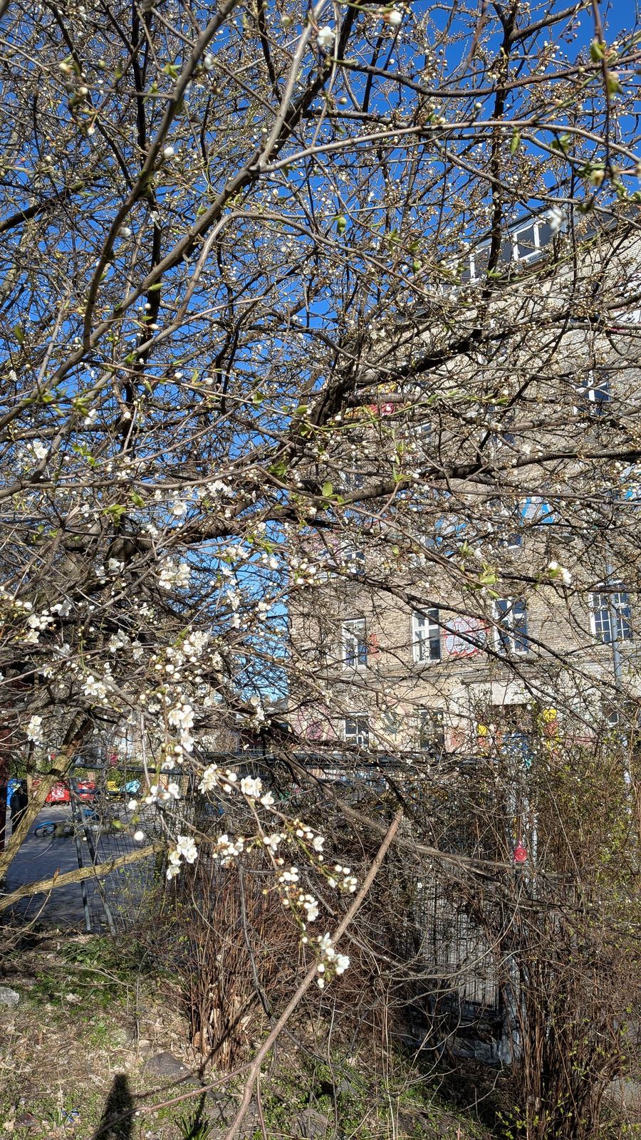 Mirabel er typisk den første til at springe ud og vil snart kunne opleves over hele landet med deres hvide slør. Den kolde vinter i Danmark i år har forsinket processen en smule. Men i læ og fuld sol, som her i på Christiania, går det hurtigere.