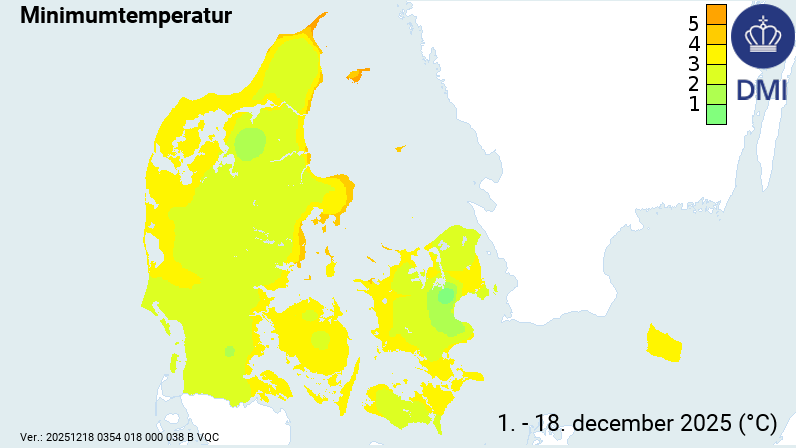 Her i løbet af nattetimerne forventer vi stadig milde temperaturer op til 9 grader og ikke skyggen af vinterlig nedbør.