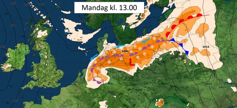 Mandag ventes et mere udbredt snevejr at rammer områderne ved Østersøen, især Bornholm. Samtidig tiltager nordøstenvinden og bliver frisk til hård. Der ventes omkring 10cm sne samt snefygning til Bornholm.