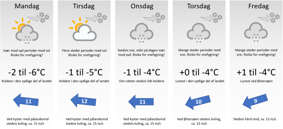 Den kommende uge ventes vintervejret at fortsætte med nogenlunde samme styrke: blæst, stedvis sne og snefygning samt fortsat bidende kulde, om end temperaturen får et lille nøk opad, som ugen skrider frem.