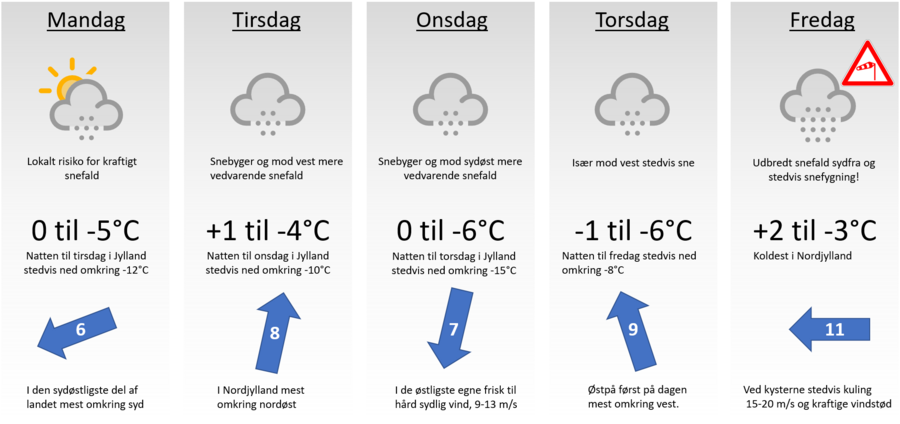 De kommende dage ventes flere mindre, men meget intense lavtryk at blive dannet ude i Nordsøen. Flere af lavtrykkene vil herefter bevæge sig ind over Danmark og stedvis være ledsaget af store mængder sne på relativt kort tid. Flere vejrprognoser giver op mod 5–15 cm sne i forbindelse med disse lavtryk, men stedvis kan der komme mellem 20–30 cm sne!