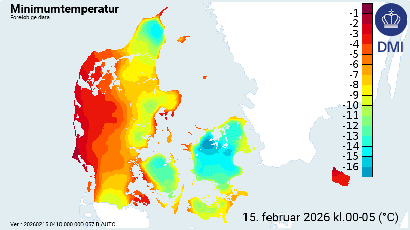 Over den østlige halvdel af landet, samt i nordøstlige dele af Jylland har der i løbet af natten været stjerneklart. Det medførte at temperaturerne styrtdykkede til ned mellem 10-15 graders frost og ved Holbæk nåede man ned på 16,8 graders frost. Det betyder, at flere steder i landet starter vi ganske koldt ud fra morgenstunden. I resten af Jylland har skydækket holdt på varmen og vi har derfor “kun” haft 2-7 graders frost.