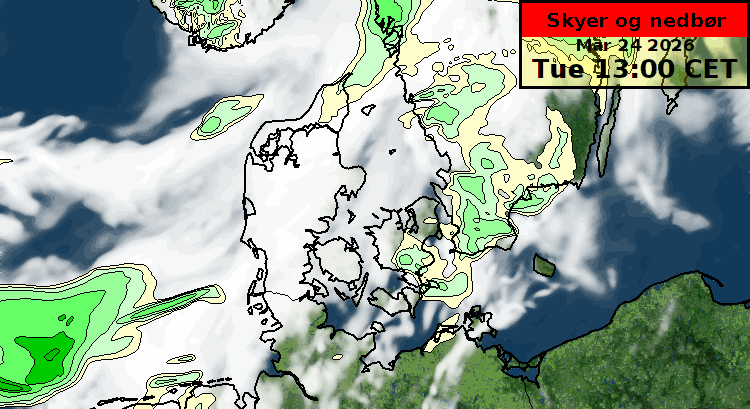 I løbet af eftermiddagen trækker en koldfront ind over Danmark og giver fra ud på eftermiddagen udbredt regn i Sønderjylland. Regnen breder sig efterhånden til resten af landet, og der ventes i eftermiddag og aften mellem 2 og 10 mm regn, mest i de vestlige dele af Jylland.