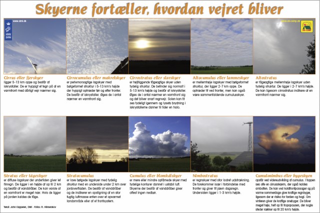 Skyplakaten fortæller den korte historie om de ti mest interessante skyer, vi ser fra Danmark og forklarer, hvad de siger om vejret. Du kan hente plakaten i to størrelser, alt efter hvad du skal bruge den til: