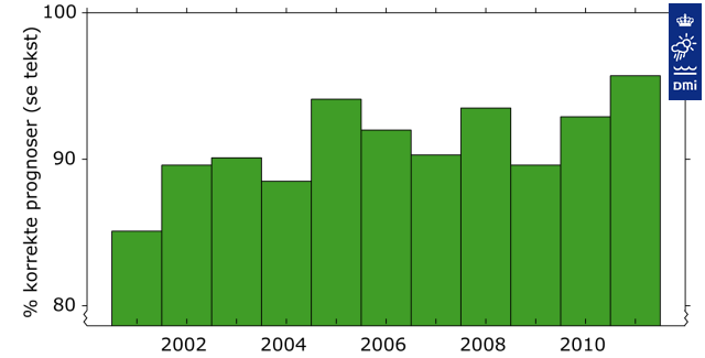 "Ser vi f.eks. på forudsigelsen af vejret i morgen, beskrevet ud fra temperaturen forudsagt med en nøjagtighed på to grader ved omkring 50 danske vejrstationer, så er vi gået fra at få ret i omkring 85% af tilfældene i 2001 til 95% i 2011. Det er dog ikke en jævn stigning, fordi vi oplever år hvor vejret i lange perioder er stabilt og nemt at forudsige og år med lange perioder, hvor vejret er variabelt og derfor svært at forudsige", forklarer Bent Hansen Sass.