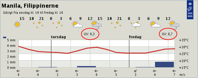 Skal du til udlandet - et varmt og solrigt sted - kan du derefter forberede dig ved at kigge de kommende dages maksimale UV-indeks som du finder på alle 150.000 byer på Verdensvejr.