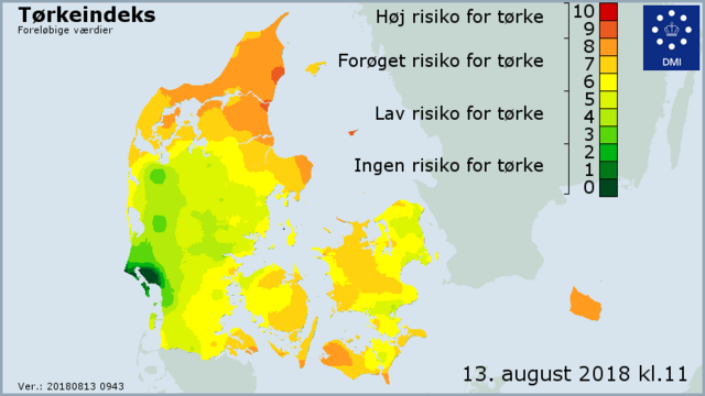Klimatolog Mikael Scharling understreger: ”I gennemsnit er tørkeniveauet dog stadigvæk lidt over normalen.” Bornholm, det nordlige Jylland og Lolland har stadigvæk store områder med tørkeindeks 8 og 9