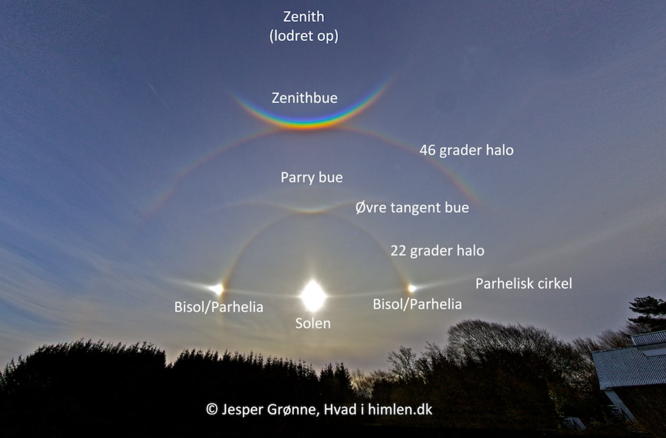 Himlen eksploderede i et festfyrværkeri af fascinerende lysfænomener denne morgen. Sol og et let strøg af høje cirrusskyer har nemlig givet optimale forhold for lysfænomener på himlen, og der er både set bisole og haloer, men også de mere sjældne af slagsen som ’himlens smil’ og den øvre tangentbue. Det har kastet en masse billeder af sig, som kræver en forklaring – og den kommer her.