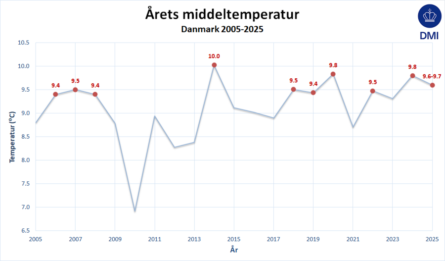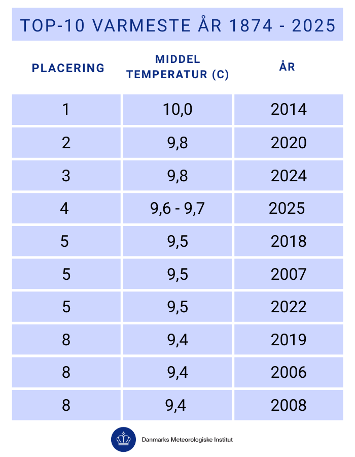 Det er helt sikkert, at 2025 ender som det fjerde varmeste år, siden DMI’s målinger begyndte i 1874. DMI’s klimatologers bedste bud er, at landets middeltemperatur ender på 9,6 eller 9,7 °C, når året rinder ud.