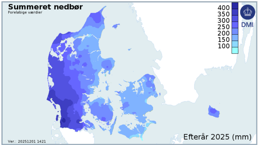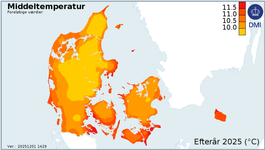 I grove træk var efteråret til den milde side med en middeltemperatur på 10,3°C på landsplan, hvilket er 0,8 °C over klimanormalen (1991-2020) på 9,5 °C. September får en stor del af æren med en middeltemperatur på 14,6 °C og en 10. plads over varmeste september måneder i målehistorien.