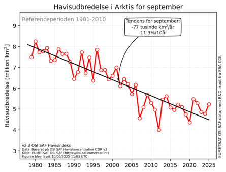 For hele september endte gennemsnittet på 5,23 millioner kvadratkilometer, hvilket gør 2025 til den 13. mindste sommerudbredelse.
