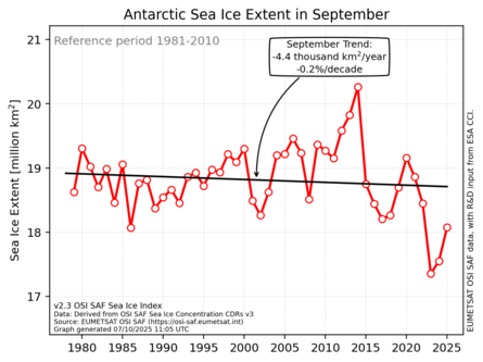 På den sydlige halvkugle har vinterisen nu nået sit maksimum med 18,07 millioner kvadratkilometer – et område omtrent 40 gange større end hele EU, men stadig et af de mindste, der er målt.