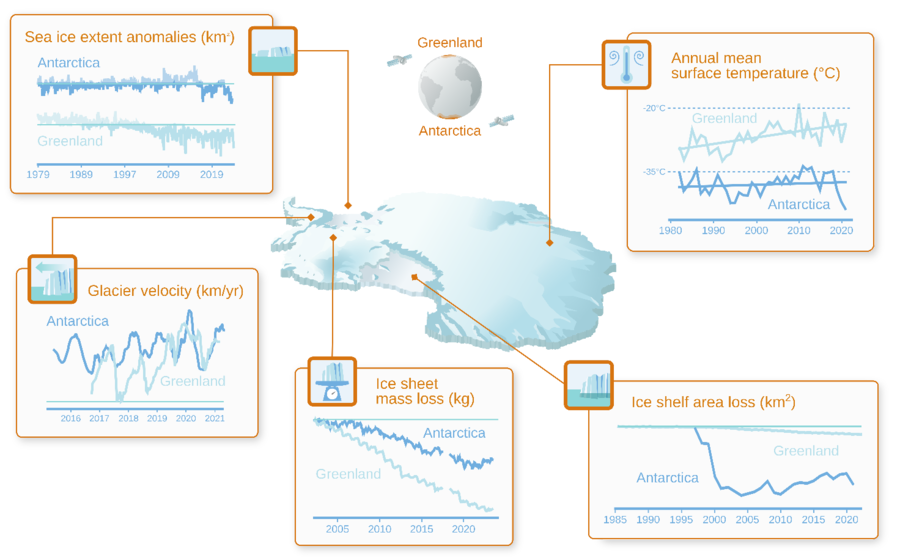 Radar- og laserscanninger følger isstrømmenes hastighed, mens havbøjer og skibe måler temperaturer og saltindhold i de oceanstrømme, der smelter isen nedefra.