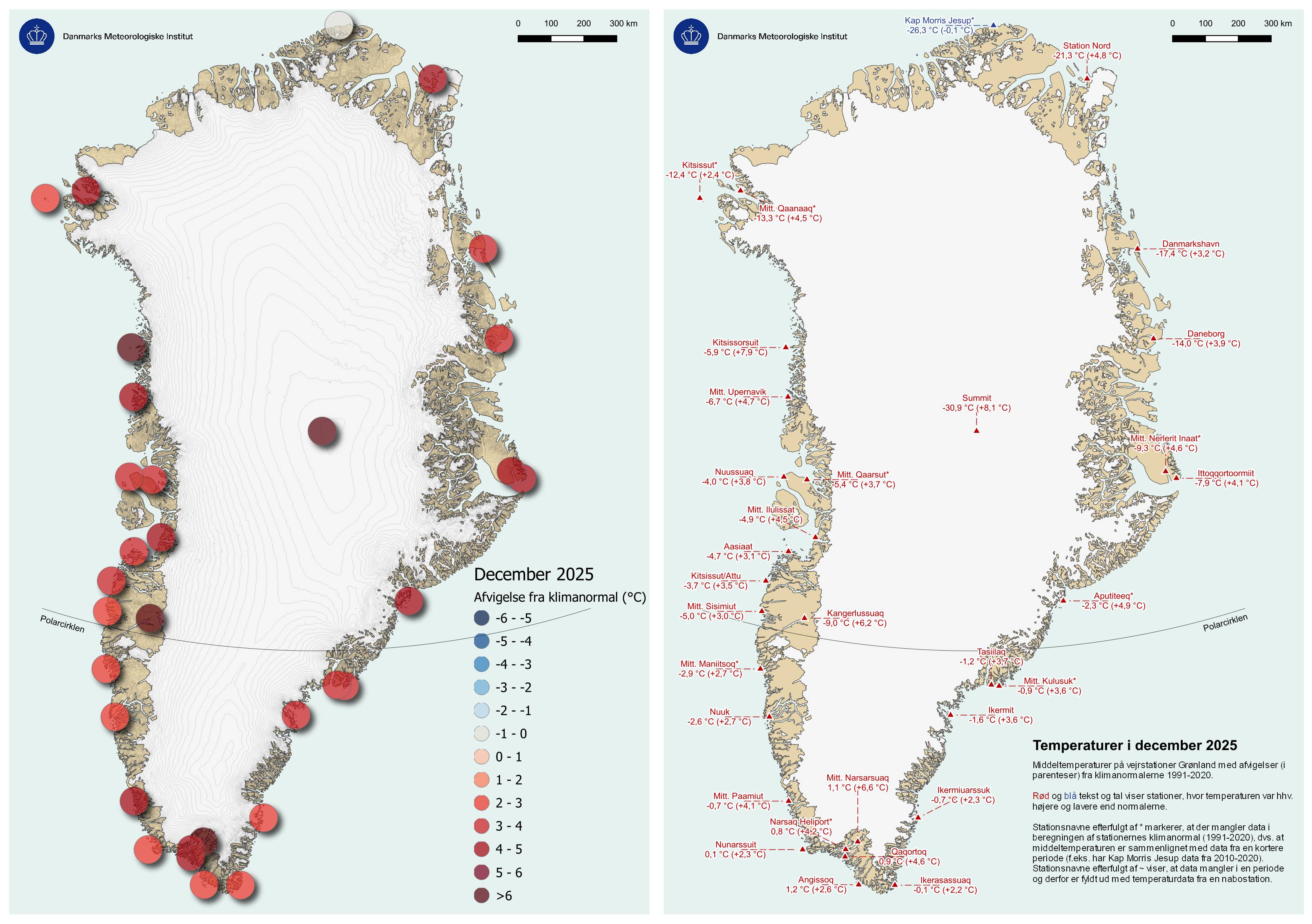 Temperaturafvigelserne fra klimanormalen 1991-2020 spænder fra +2,2 °C ved Ikerasassuaq (Prins Christians Sund øst for Grønlands sydspids) til +8,1 °C ved Summit. Ved Aputiteeq i Sydøstgrønland endte december også rekordhøjt med en månedsmiddeltemperatur på –2,3 °C, hvilket er 4,9 °C højere end en gennemsnitlig december. Ved syv andre vejrstationer indplacerer december sig desuden i top-3. Som den eneste undtagelse havde Kap Morris Jesup – Grønlands nordligst placerede vejrstation – temperaturer omkring det normale.