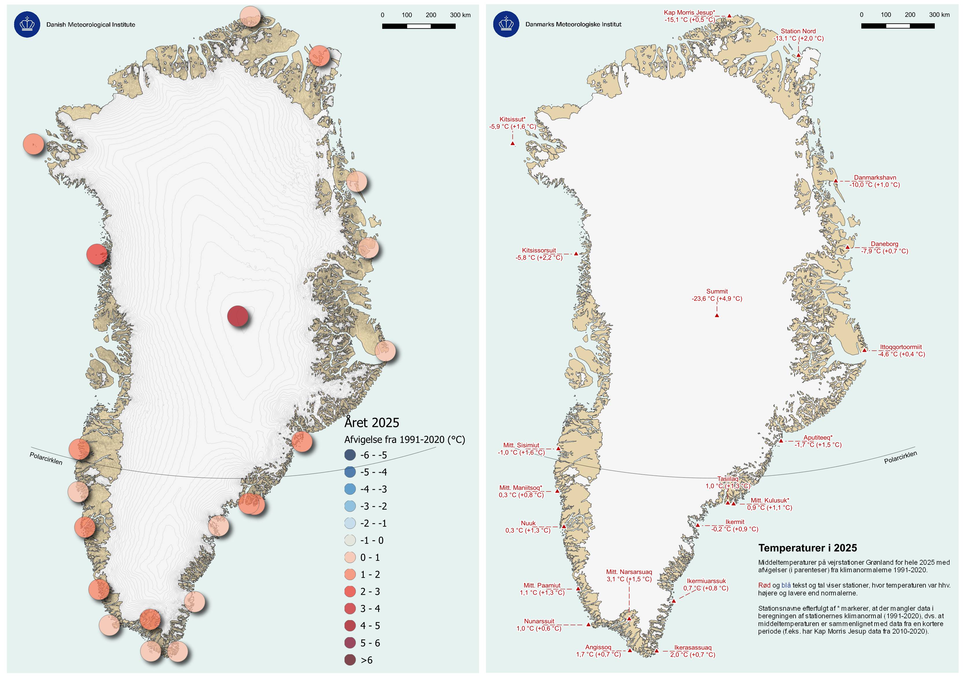 Årsmiddeltemperaturerne i 2025 var højere end normalt ved alle stationer i Grønland, og Summit trådte igen tydeligt frem. Intet mindre end fire måneder – april, august, november og december – endte som de varmeste måneder siden 1991. Månederne marts, maj, juni, juli og september endte desuden i top-3 over varmeste måneder.