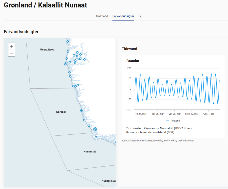 Som noget nyt er lokaliteterne med tidevandstabeller også repræsenteret som små punkter langs Grønlands kyst. Med et klik på det ønskede farvand og lokalitet får man et hurtigt overblik over høj og lavvande.