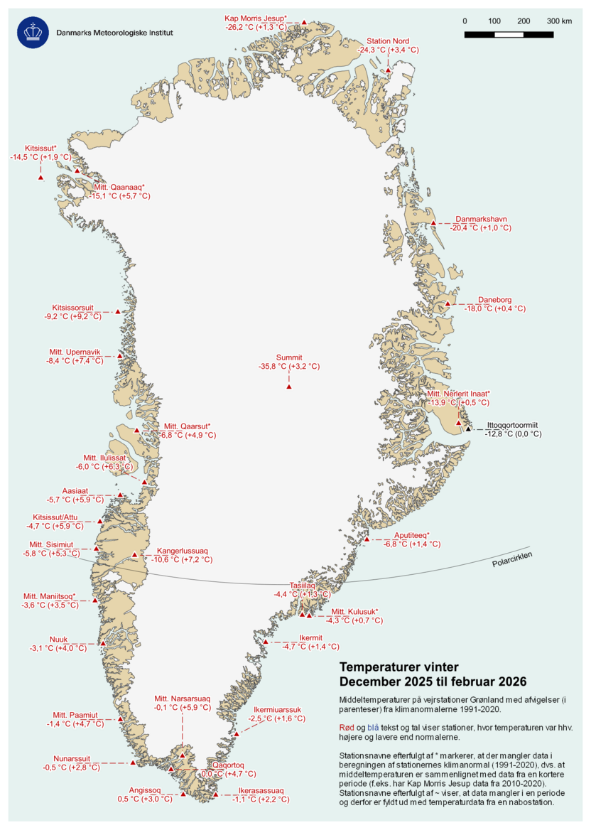 Vinteren 2025–2026 i Grønland begyndte med markant varme og flere temperaturrekorder langs vestkysten. Men i løbet af februar faldt temperaturerne generelt, og det trak vinterens samlede temperaturgennemsnit ned flere steder.